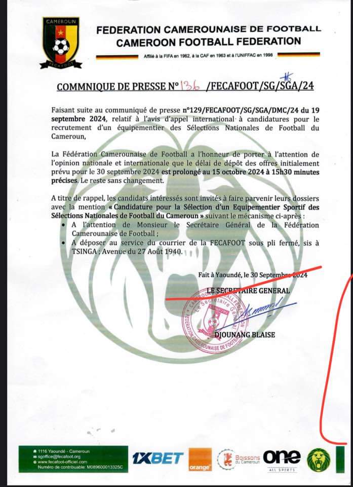 « Faisant suite au communiqué de presse n°129/FECAFOOT/SG/SGA/DMC/24 du 19 septembre 2024, relatif à l’avis d’appel international à candidatures pour le recrutement d’un équipementier des Sélections Nationales de Football du